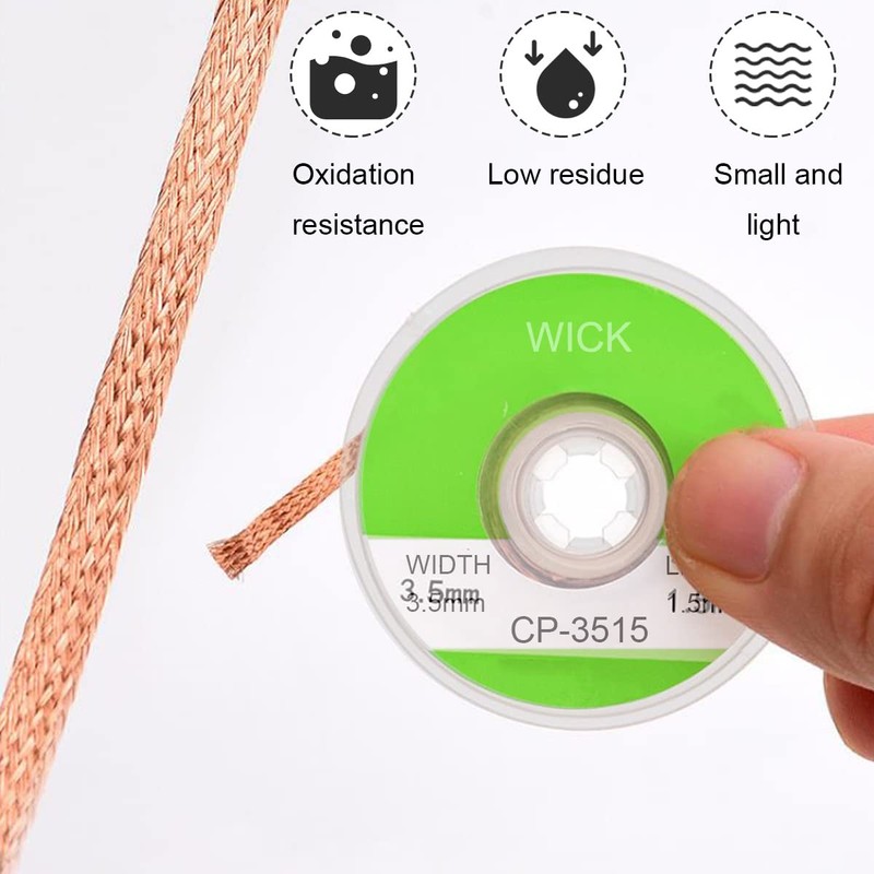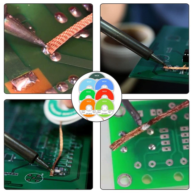 - Various Size: 7 rolls of desoldering braid wire with a length of 1.5m. The width of each roll of desoldering braid wire is different, they are: CP-1015 (width 1 mm), CP-1515 (width 1.5 mm), CP-2015 (width 2 mm), CP-2515 ( width 2.5 mm), CP-3015 (width 3 mm), CP-3515 (width 3.5 mm), CP-4015 (width 4 mm).