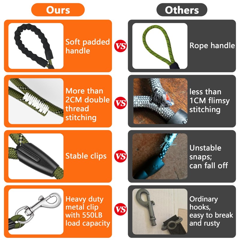 - Soft Padded Handle: The handle of long leash is made of a soft and sturdy EVA,the thickness was upgraded to 0.24 inches, 33.3% thicher than others, which is for amazing comfortable shock grip, protects your hand from rope burn, and will afford you and your dog many enjoyable walks together hassle-free.