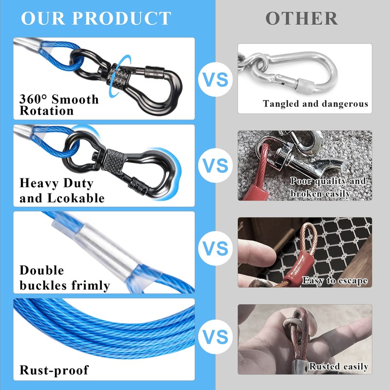 - ULTRA STRONG: XiaZ dog wire cable is made of high quality stainless steel wire rope, the pull is up to 5 KN by professional tensile test, ultra strong and durable for samll medium large dogs, giving more space to move around freely while keeping him safe.