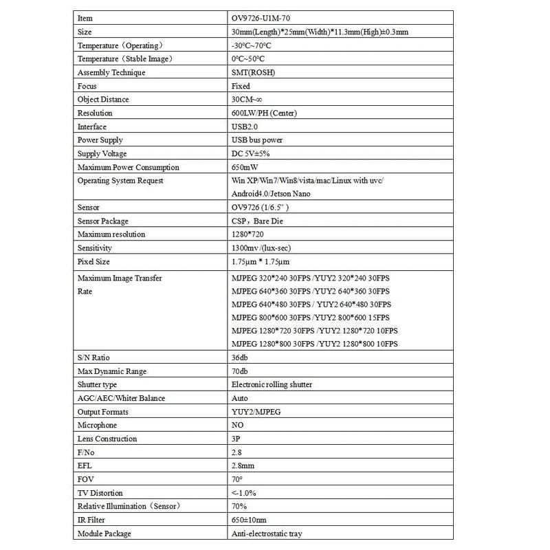 - This OV9726 fixed focus camera module adopts high speed USB 2.0 interface, directly plug and play, supports OTG protocol, standard UVC protocol