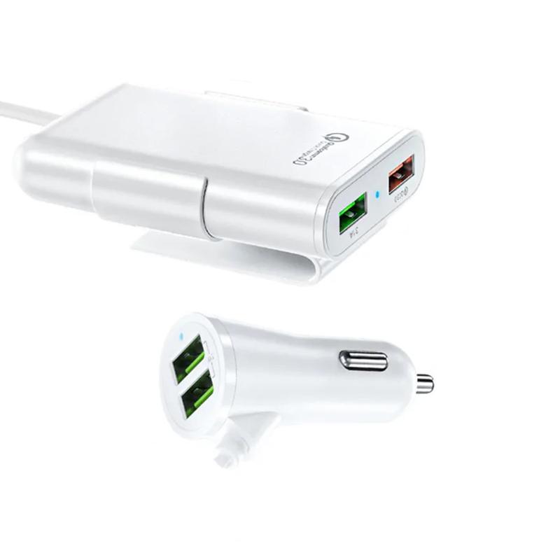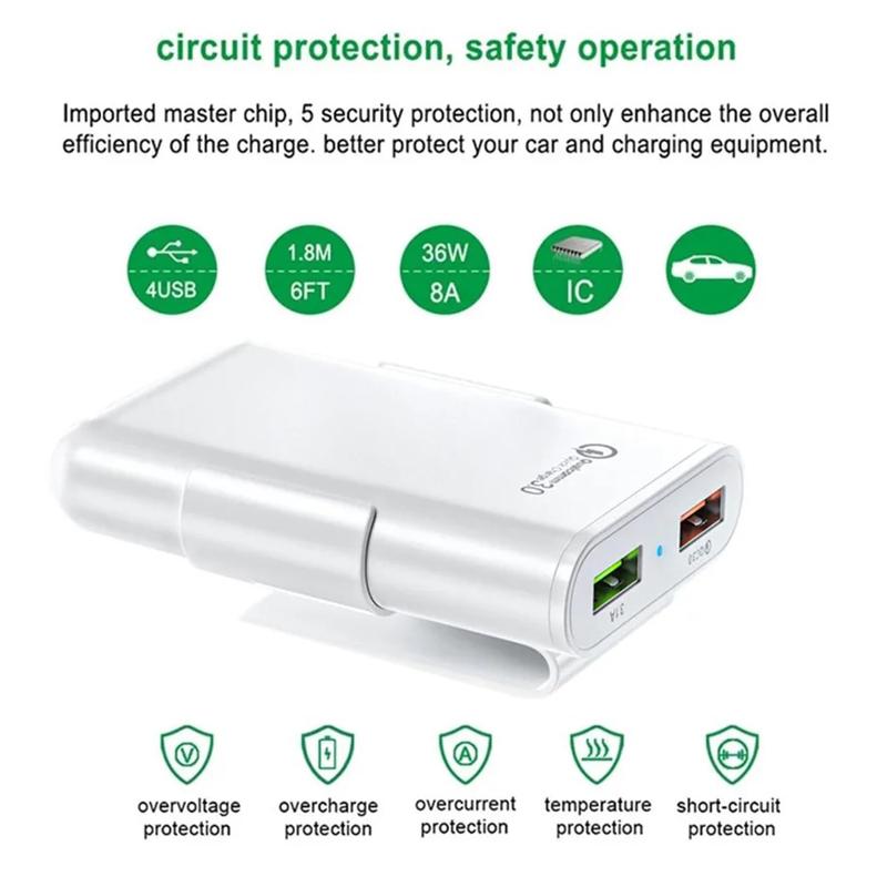 • QC3.0 fast charging 8A one-to-four car chargers, four ports fast charging at the same time without waiting! Both front and rear passengers can enjoy the ultra-fast charging experience, with a single port up to 18W output, and intelligent recognition equipment automatically matches the best current.