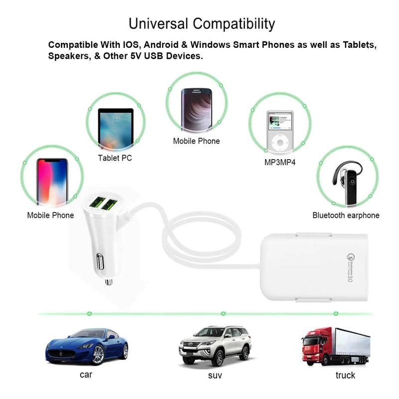• 8A high-power design, four ports can be used simultaneously without speed reduction, supporting multiple fast charging protocols such as QC3.0/2.0, Huawei FCP, Samsung AFC, etc. Comes with a 1.5-meter extended charging cable, front and rear rows can be charged at will.