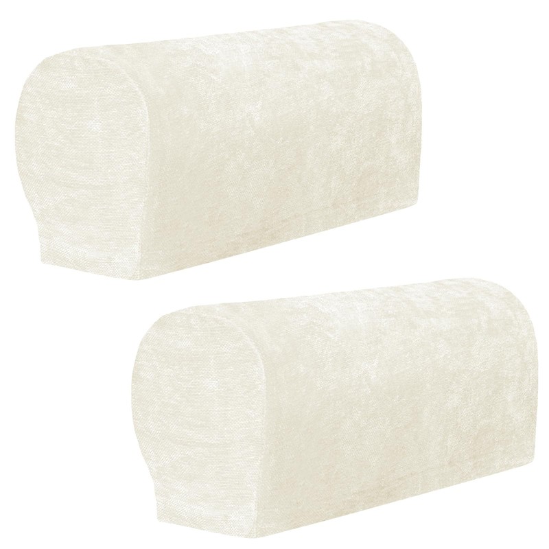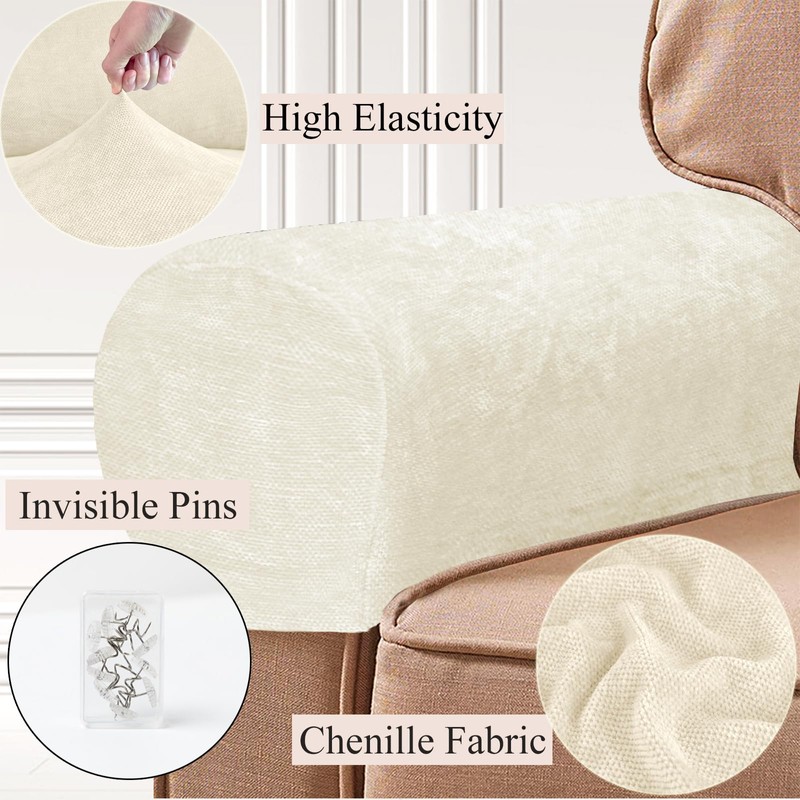 XIEHUZA 1 Pair Chenille Stretch Armrest Covers, Skin-Friendly Arm Covers Protectors for Sofa Couch Chairs Recliner, Non-Slip Armchair Slipcovers with Twist Pins (White)