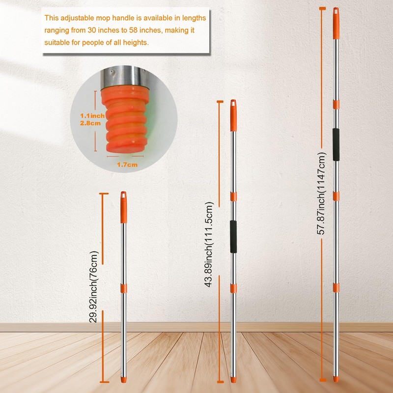 - Adjustable Length for Maximum Comfort: Say goodbye to bending over while cleaning! This adjustable mop handle can extend from 30" to 58", making it ideal for people of all heights. Whether you're short, tall, or somewhere in between, this pole adapts to your needs for a comfortable cleaning experience.