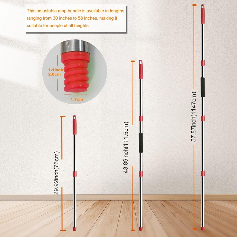 - Adjustable Length for Maximum Comfort: Say goodbye to bending over while cleaning! This adjustable mop handle can extend from 30" to 58", making it ideal for people of all heights. Whether you're short, tall, or somewhere in between, this pole adapts to your needs for a comfortable cleaning experience.