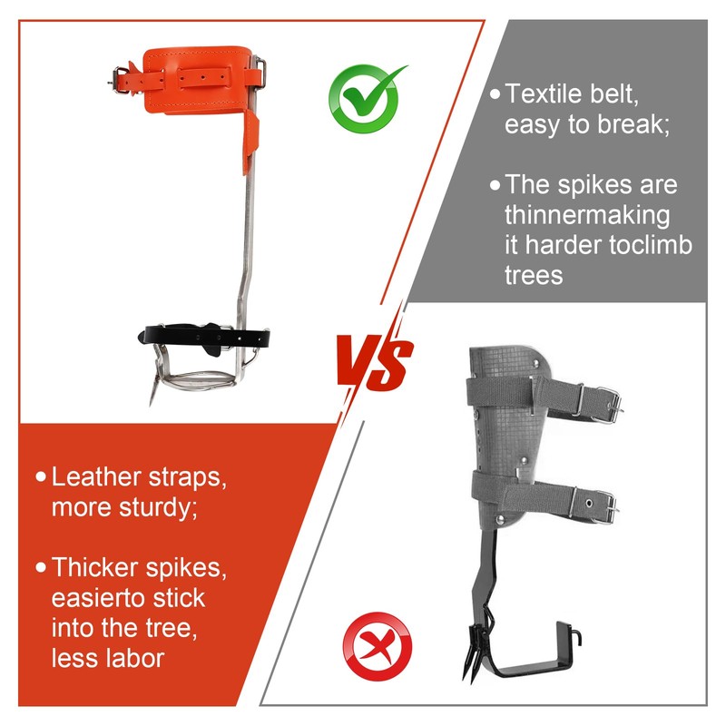 - Reliable Made: Our tree climbing tool has wear-resistant stainless steel claws and thickened cowhide straps. The adjustable climbing belt is made of strength polyester which has a strong load-bearing capacity. Our tree climbing spikes are crafted for longevity and reliability, ensuring you have the strength and support necessary for navigating through branches.