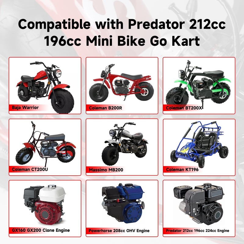 - Fitment: For Coleman CT200U CT200U-EX BT200X CT200U-A RB200 B200R Trail 200, Baja MB165 & MB200 (Heat, Mini Baja,Warrior), Massimo MB200, Realtre* RT200, Axi* M200, Mega Mot* Mega Max MM-B212MX, Monste* Moto Classic 212cc, TrailMaster MB200-1/ Storm 200, Falcon 200, RPS Falcon mini bike, Coleman KT196 BK200 RTK200 go cart, Hammerhea* 80T/ MudHead 208R/ Mini Shark go-kart, TrailMaster Buggy Interceptor, TrailMaster 163 Mini XRX/ XRS+, Yerf Do*, Murray, Manco, MotoTe* Mud Monster XL go kart