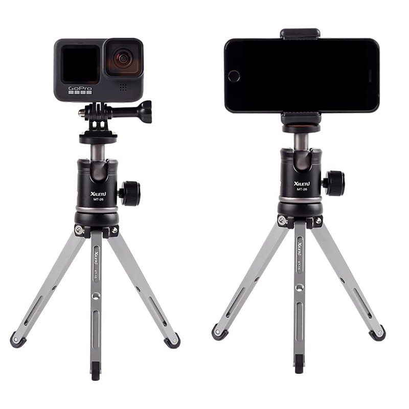- Wide range of usage: The mini camera tripod can also be used as a smartphone tripod or GoPro tripod. Attach the included smartphone holder or GoPro mount to a mini tripod to watch online classes or videos, or play games, attach a camera, LED light, microphone or GoPro camera, and you can use it for taking pictures of YouTub or TikTok (Tick Tok), or for telework, remote work, TV conferencing, etc. Package Contents: 1 x XT15 mini tripod, 1 x MT26 free-head head, 1 x smartphone holder, 1 x strap, 1 x hex wrench, 1 x storage bag
