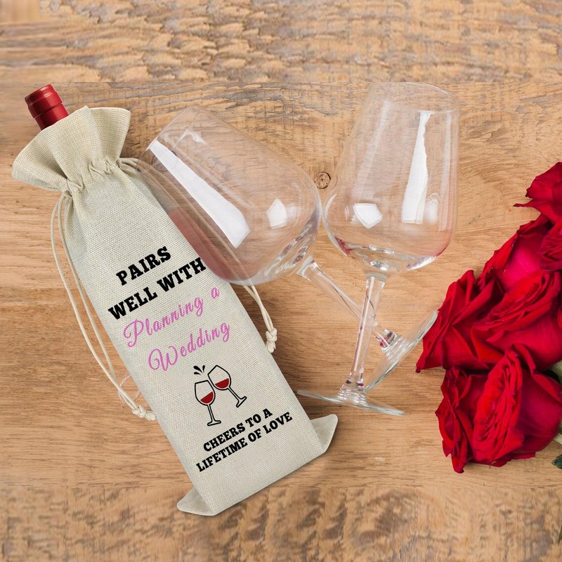 - Wedding Planning Gifts: This wine bag printed with “Pairs Well With Planning A Wedding Cheers to a Lifetime of Love”. This will be a great engagement gift for couples and a great wedding planning wine bag.