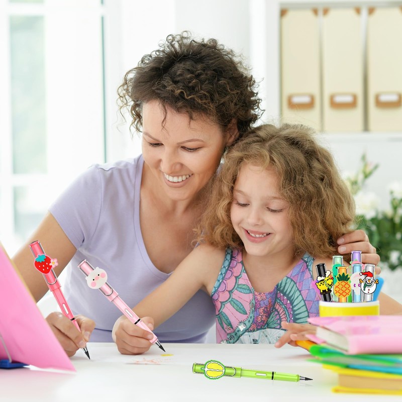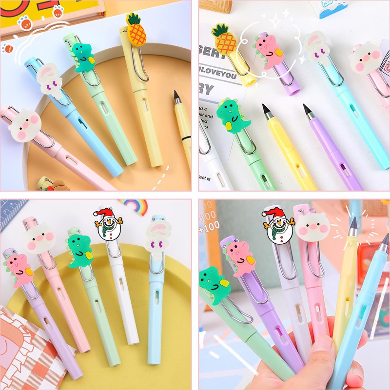 - Pencil set: Our eternity pencil set contains 10 timeless pencils in different colours and 10 refills, with an eraser in each pen holder. And the pen caps are decorated with unique cartoon images such as pineapple, avocado, durian, strawberry, dinosaur, Christmas snowman, piglet, white rabbit and elk.