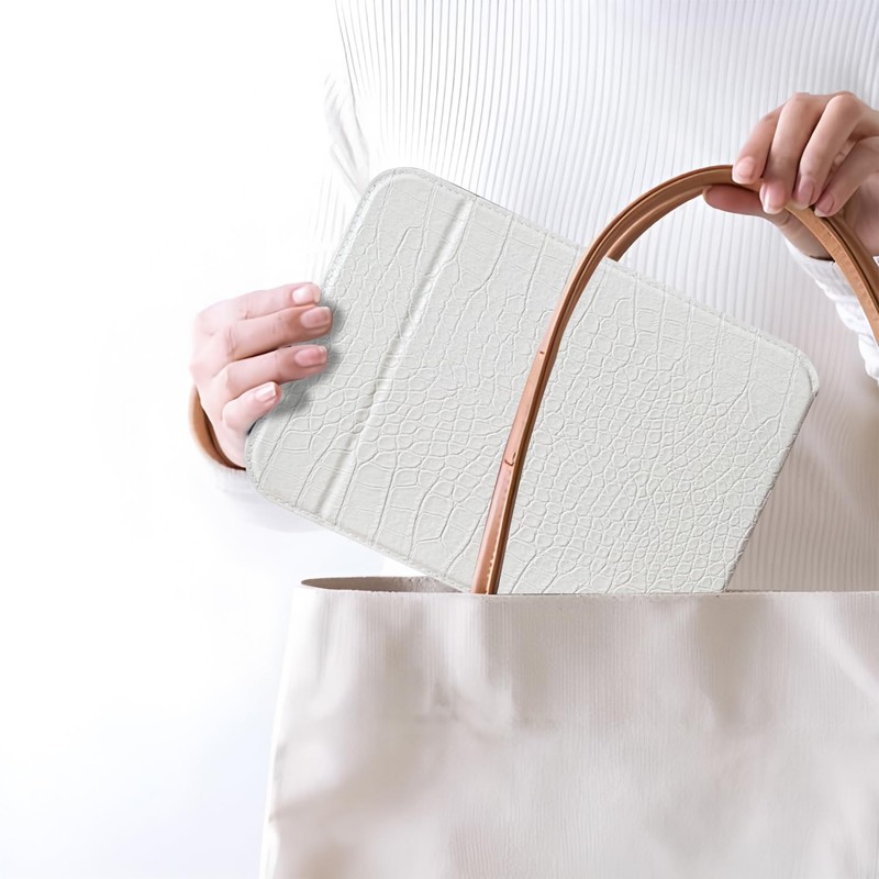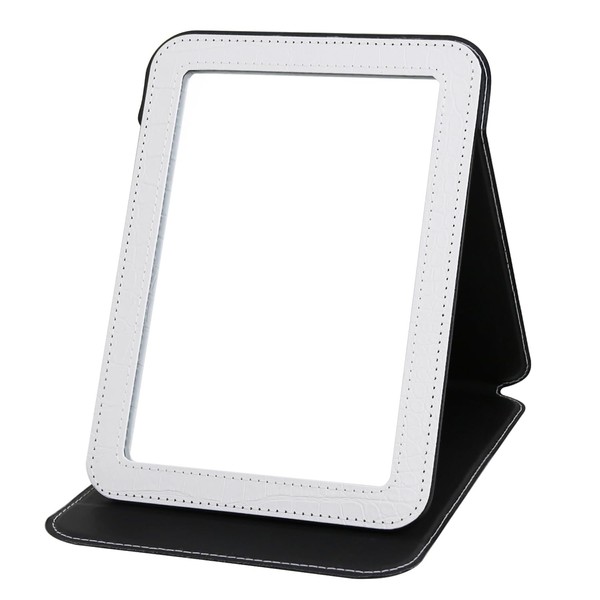 Ximruyuv White Foldable Desk Mirror, 6.5×8.9” Adjustable Angle Rounded Rectangle PU Edge Covering Travel Mirror with Stand (LWhite)