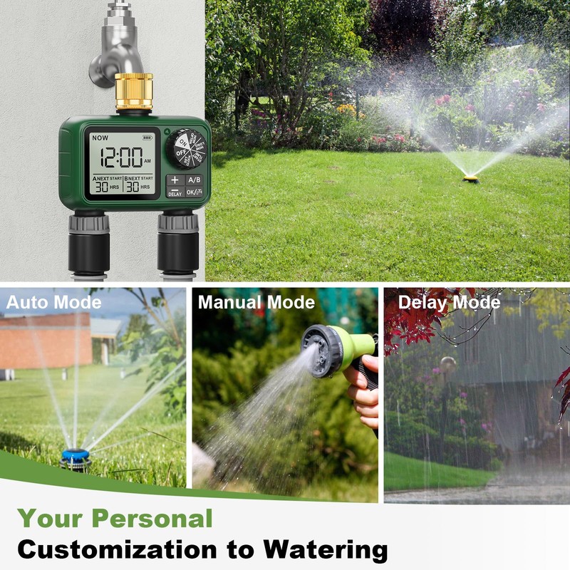 - Permanent irrigation in automatic mode. The automatic watering program does all the work for you. Now everything runs on its own. Ideal for absence during a business trip or on holiday. Can be used in the garden, lawn, yard and other places, it can meet your daily life needs of the sprinkler timer.