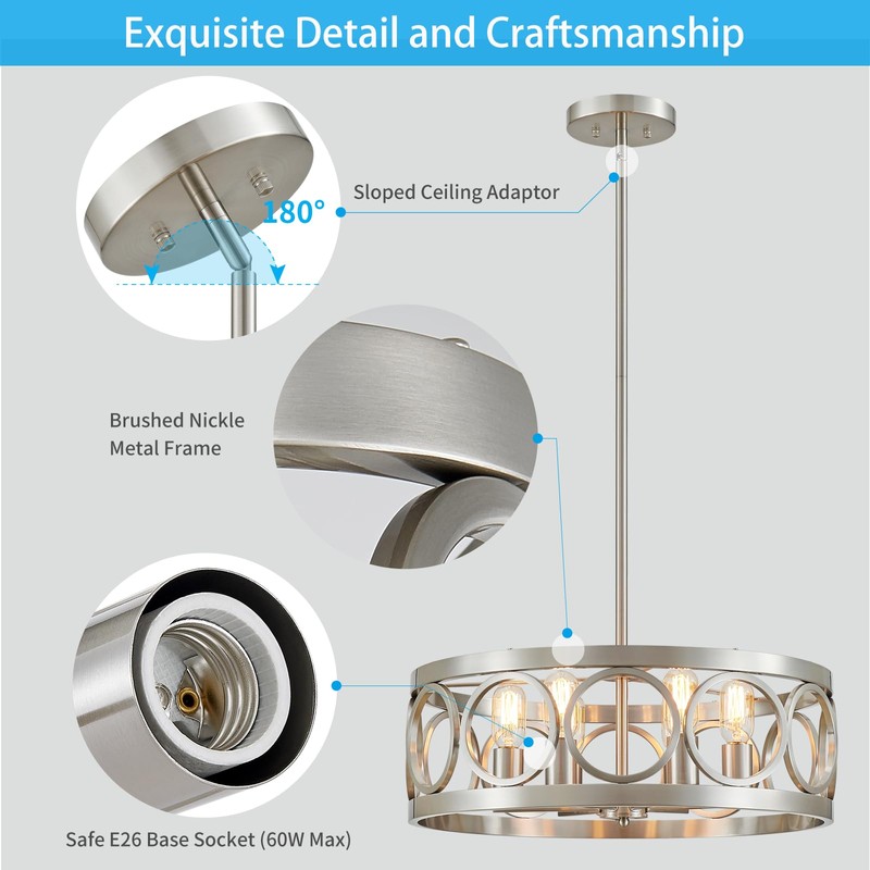 - [Perfectly Versatile] This farmhouse chandelier has a unique open drum frame with nickel finish. The chandelier is made of metal, not plastic. Beautiful and durable. It will perfectly complement decorative styles from modern to farmhouse. Brighten up your home kitchen, dining room or farmhouse style place.