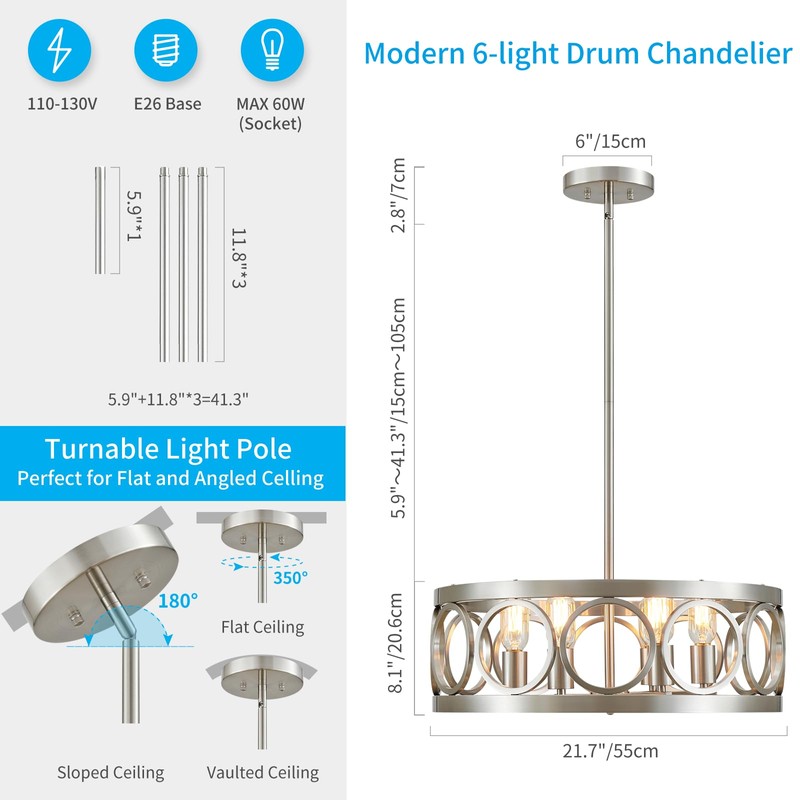 The 5-Light Drum Chandelier features an antique Nickle finish and modern design which is perfect for any of your rooms, make a statement in any interior design without occupying valuable floor space. With little assembly, this light fixture is easy to bring the room together with its illumination and captivating design.