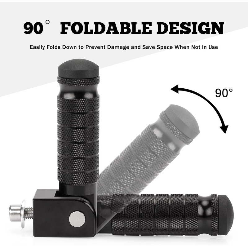90-Degree Foldable: Designed with a 90-degree foldable support rod, these foot pegs for motorcycles can be fixed in an "L" shape for optimal positioning. The folding mechanism helps prevent damage and allows for compact storage, making them perfect for riders who need a space-saving solution without compromising performance.