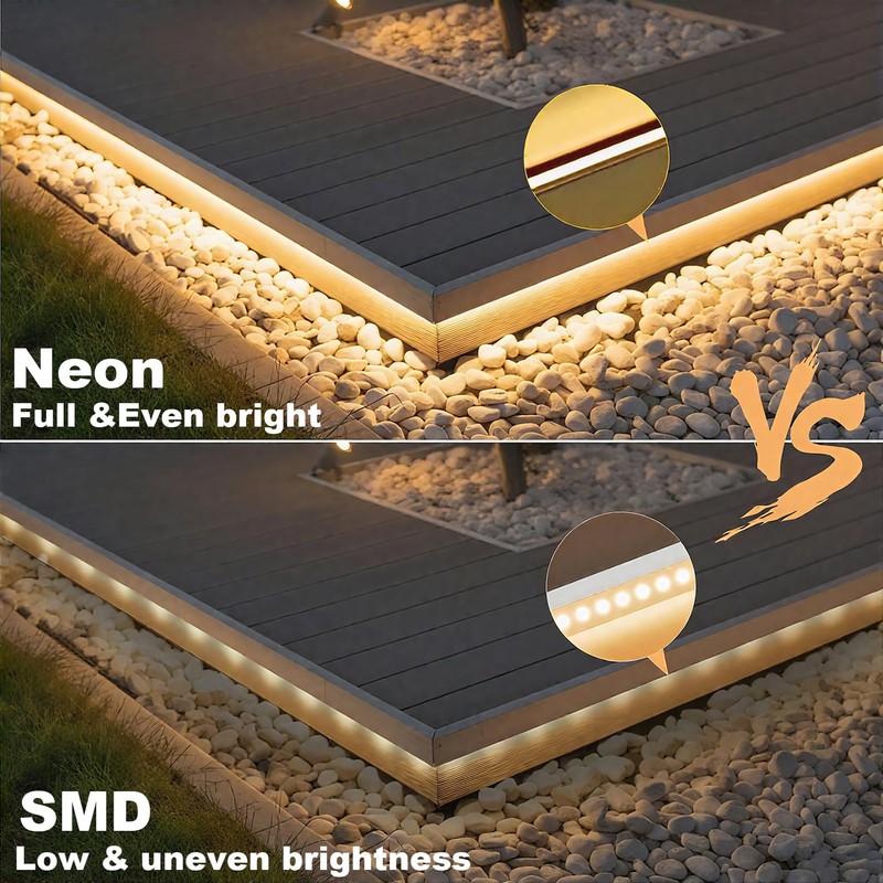 - Neon Light with ultra-bright LEDs : Light strips delivers 3000K warm white glow for cozy living rooms, TV LED backlighting, gardens, parties, and e-sports setups. Side lighting + 120° wide projection ensures uniform, spotless brightness, brighter than regular led rope light