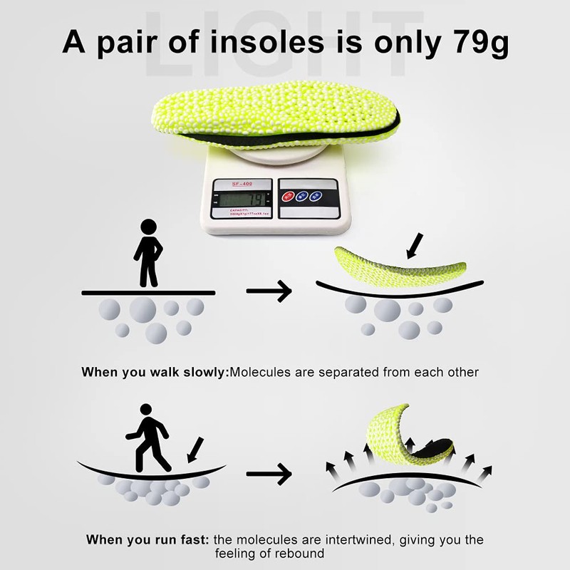 - E TPU Material This booster insole is made of eco-friendly and recyclable E TPU material, which is safe and odorless, lightweight, soft, flexible and durable. The wearing comfort is much higher than other PU and EVA material insoles