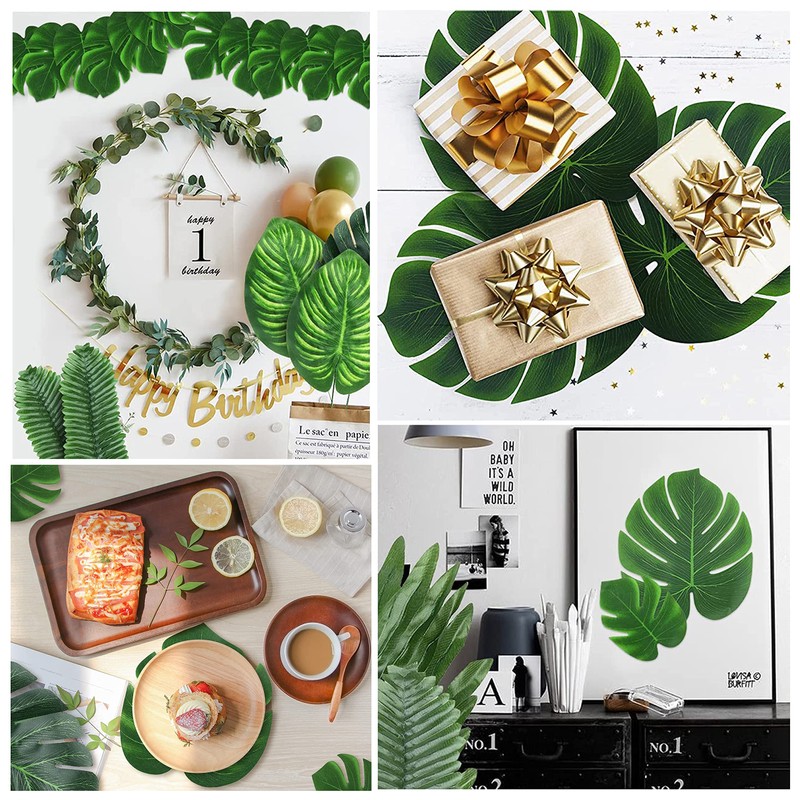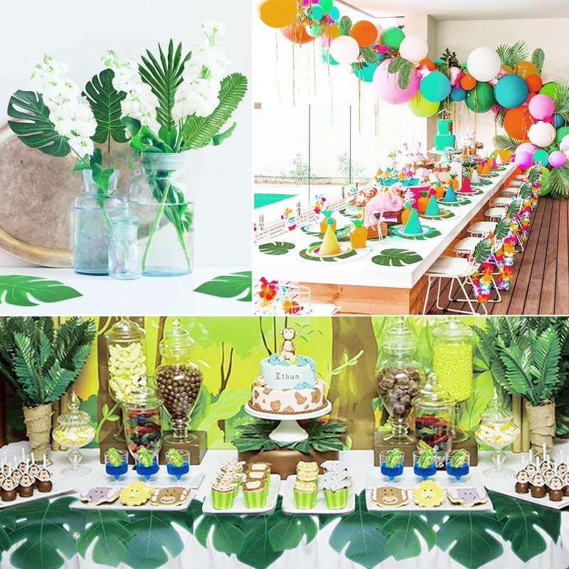- Party Decorations:Use the flat monstera leaves as a coaster or stick some leaves onto the wall, assemble the stemmed- leaves into vases.These faux palm leaves are great decors for Luau Parties,Tropical Hawaiian,Safari Party,Beach Theme,Wedding,Birthday,Jungle Theme,Aloha,TIKI Parties.