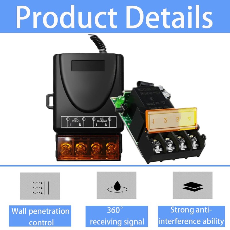 • Package Includes:2 x ON/OFF Remote Control Switch, 1 x High-Power Receiver,4 x increws,4 wiring terminals