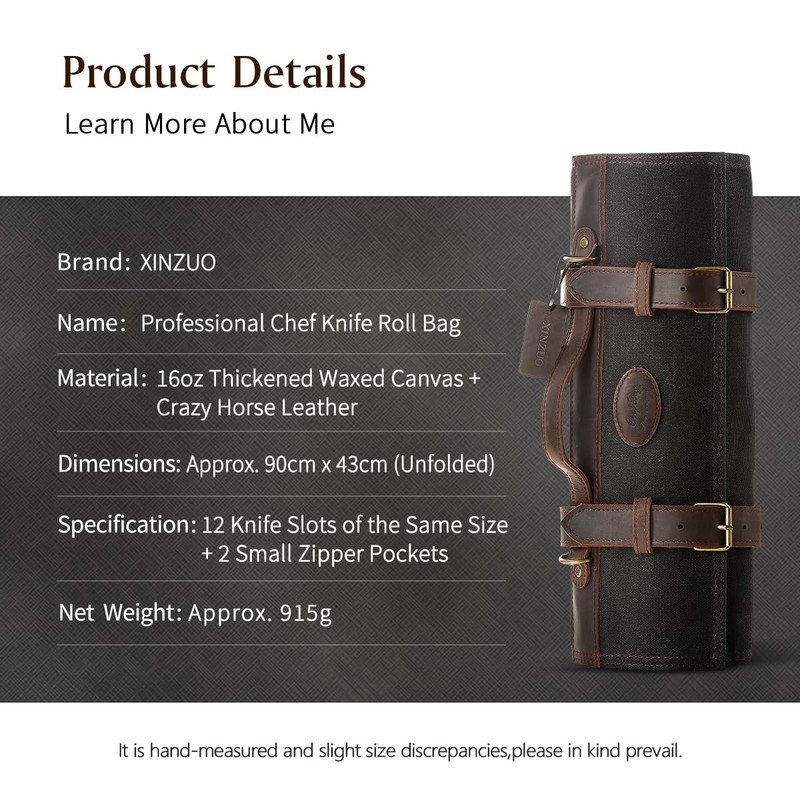 XINZUO Chef Knife Roll Bag Professional,16oz Waxed Canvas and Crazy Horse Leather,12 Slots Plus 2 Zipper Pockets,Adjustable Shoulder Strap-Travel Tool Roll Pouch(Bag Only)
