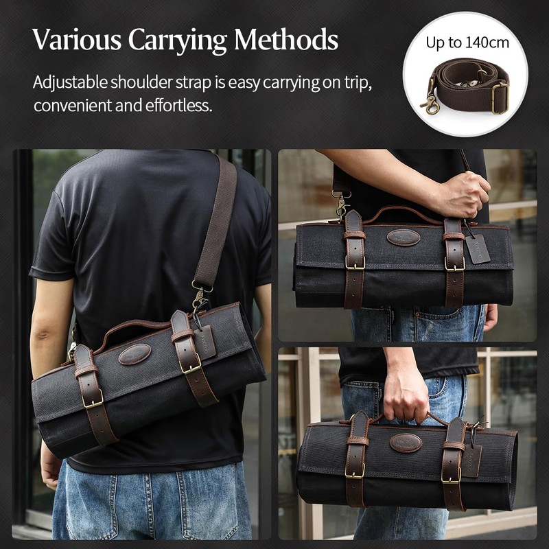 - 【Carry Your Knives with Ease】This chef roll bag prioritizes your comfort and convenience. The ergonomic carrying handle ensures a secure grip, while the removable and adjustable shoulder strap offers versatile carrying options – crossbody, hand carry, or side carry – for effortless transport. Whether you're dashing to a catering event or simply organizing your kitchen, this bag allows you to navigate with ease.