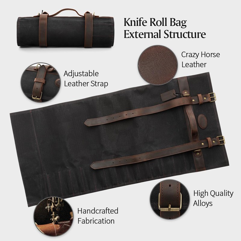 - 【Premium Bag Material】This chef roll bag is made of high quality 16oz waxed canvas with crazy horse leather. Waxed canvas is durable and resistant to abrasion, tears and punctures.It is water resistance to keep your knives in safe.With well made alloy metal buckles and fasteners,it built to last.