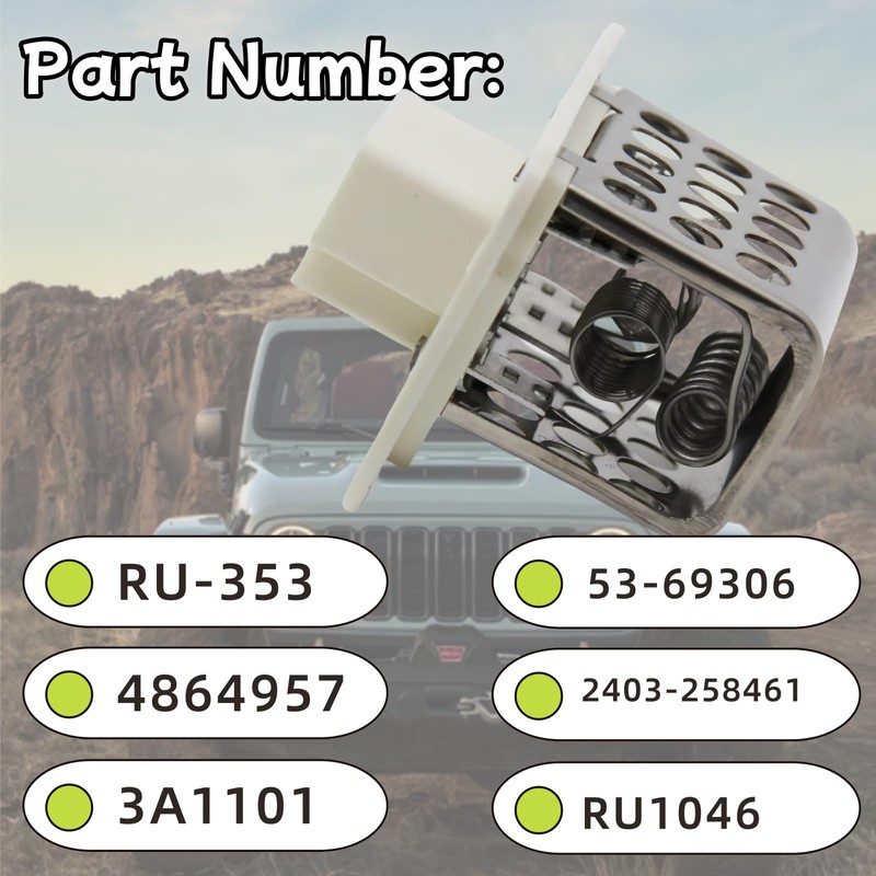 - Replace part number:This Blower Motor Resistor is compatible with # RU-353, 4864957, RU-353, RU353, 3A1101, 53-69306, 2403-258461, RU1046, CR158. Please check the description and compatibility chart to make sure if the resistor fits your vehicle before your purchasing..