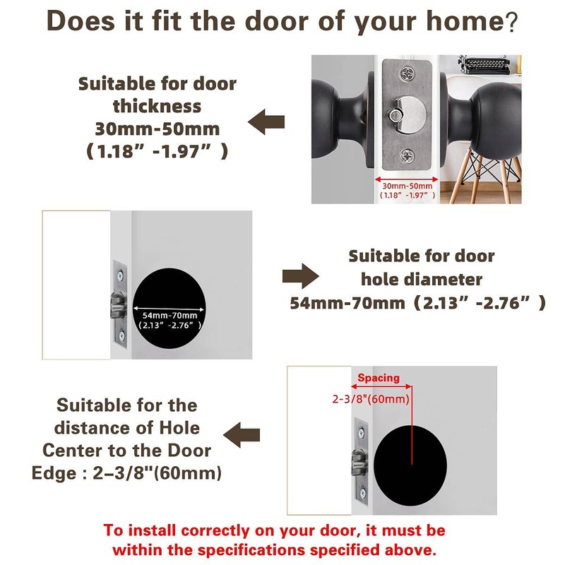 - door lock with key:Door hole diameter:(2.13-2.76”,54-70mm),Not can't more than 2.76” or 70mm.Otherwise it cannot be installed.Please measure the door of your home before buying.