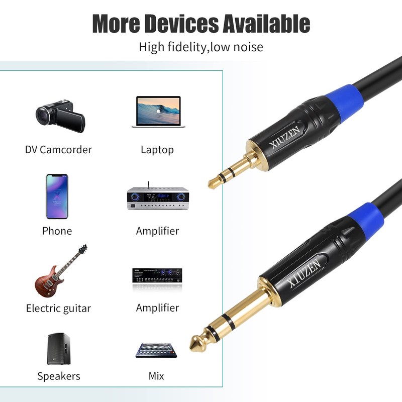 - Easy connection:Excellent 3.5mmTRS to 6.35mmTRS stereo male cable, it is ideal for Connecting your smartphone, iPod, iPod, laptop or PC with a 3.5mm jack output to a device with 6.35mm jack inputs such as speakers, mixing console, home theater devices, amplifiers and so on.