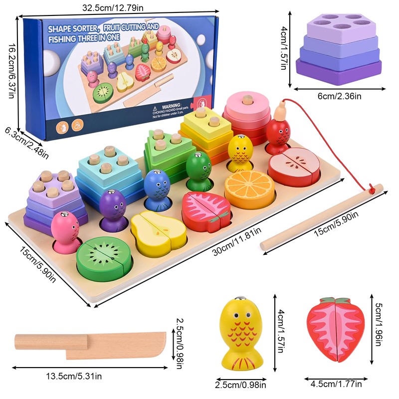 - Montessori toy for children aged 3 and up: This Montessori toy includes: 6 magnetic fish, 5 fruit shapes wooden blocks, 5 shapes stack wooden blocks. Montessori toy 3 in 1 can cut fruits, sort shapes and fish, let you and your children have fun.
