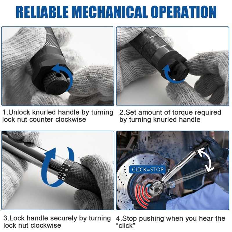 - 【SAFE AND RELIABLE】: When the set torque value is reached, the automotive torque wrench will emits "Click" sound to remind you to stop applying force to prevent over torque damage to your items. Also the knurled handle provides non-slip operation.