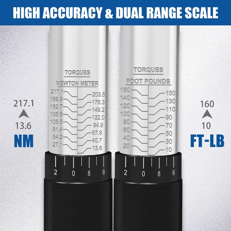 - 【HIGH ACCURACY】: This 1/2 drive torque wrench provides a 10-160ft.-lb/13.6-217.1Nm range. Accuracy error within ±4%, with a formal calibration certificate. Professional torque wrench production process ,with higher precision.