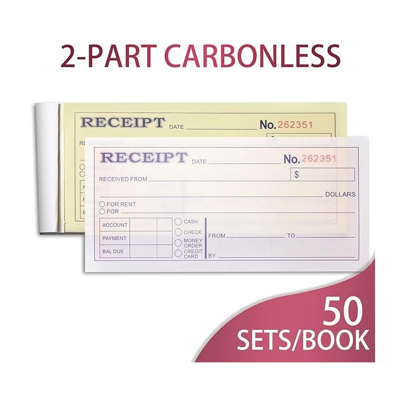 - Two-Part Carbonless Receipt Book: Each receipt book has 50 sets of receipts, each with a white/light yellow section and the yellow section is kept in the receipt book to maintain detailed records.