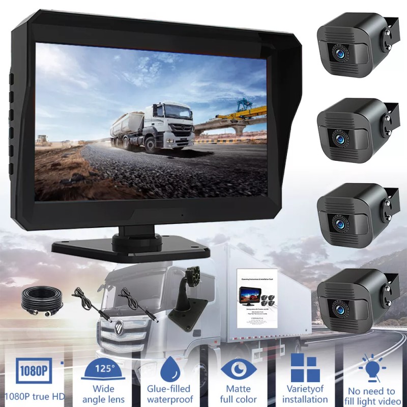 10.1 inch 1080P Monitor : Wide 10.1 inch Screen,so we can observe 100% road situation.Larger screen,safer driving.4 split screen,4 channels,4 different angles help us to get a 360 degree view.For rear,parking, front, side,left,right,hitch,turn signal view.We also can choose the monitor to display 1/2/3/4 cameras' image.