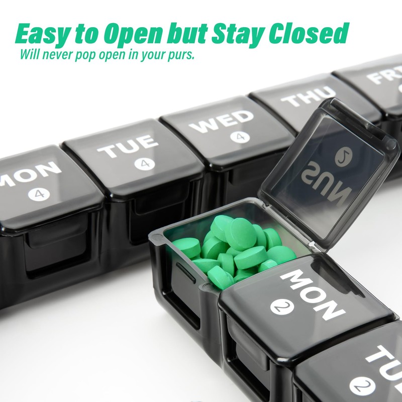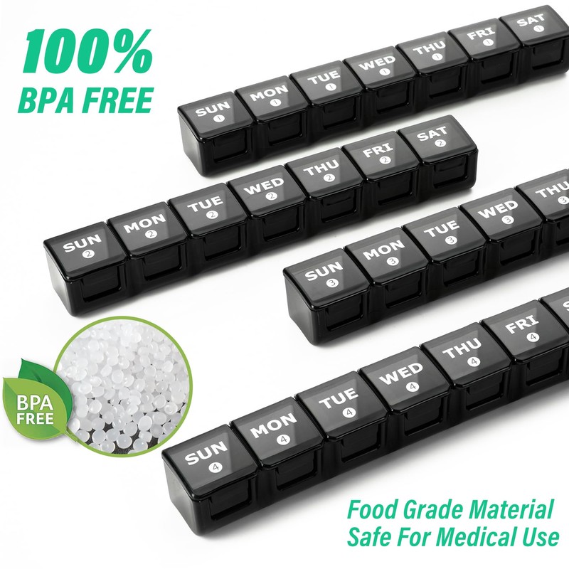 • PREMIUM MATERIAL: Daily dosette box is made of food-grade PP plastic while outer pill container is made of ABS plastic, BPA-free and safe for medical use.