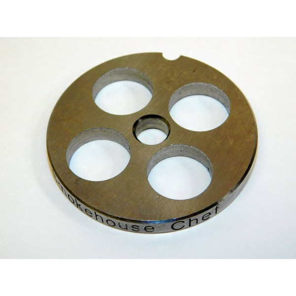 NEW EXCLUSIVE SIZE. EXTRA LARGE grinding hole for Chili and stew grind when using your Chefs Choice meat grinder. #5 electric or manual meat grinders, choppers and mincers. Fits Chefs Choice, LEM, Cabelas, Torrey, Hobart, Smokehouse Chef, Universal, and others. Great for hunters who make their own sausage. This plate will also fit the top of the line Smokehouse Chef meat grinder. Fast shipping from Smokehouse Chef