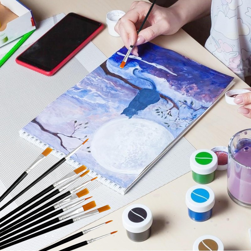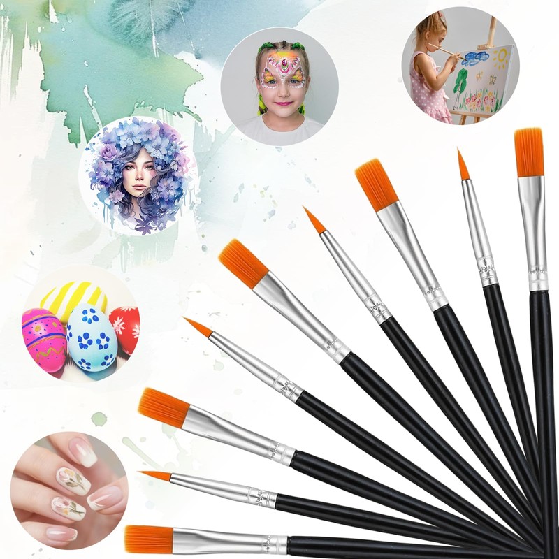 - Application tips: the small brush set is easy to use, flat brushes are suitable for drawing thick and thin lines, round brushes draw precise and sharp edges, a large number of brushes allows colour change and more efficient painting work.