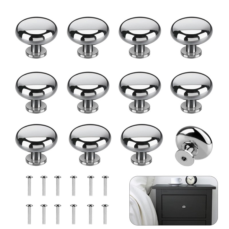 XMDROU Pack of 12 Furniture Knobs, Silver, Cupboard Knobs, Stainless Steel Drawer Knobs, Cupboard Knobs, Chest of Drawers Knobs with Screws, Round Cabinet Handles