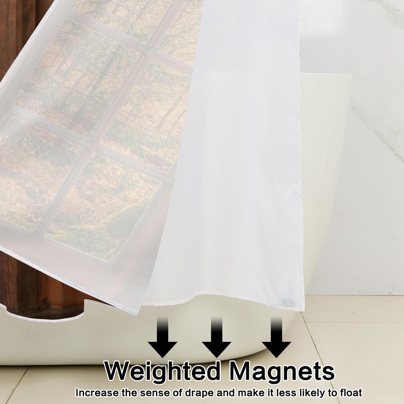 - 【Hotel and Spa Style】: This no hook bath curtain with a snap-on liner set creates a hotel-inspired bathroom. The bottom two ends of the shower curtain liner with 2 weighted magnets (iron core baking paint material), support for washing, not easy to rust drape increased, can be connected to the bathtub to protect privacy. Give you a good bathing time, aslo a good choice for bathroom decorations.