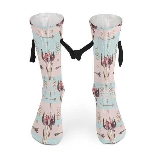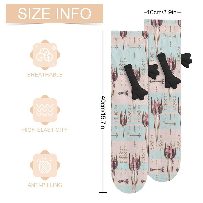 Xmkltbz 1 Pair Soft Socks Black Holding Hands, Compression Knee High Stockings Long Athletic Circulation 16x3.9 in Print Tribal Cow Bull Head with Flowers Arrows Floral Pattern