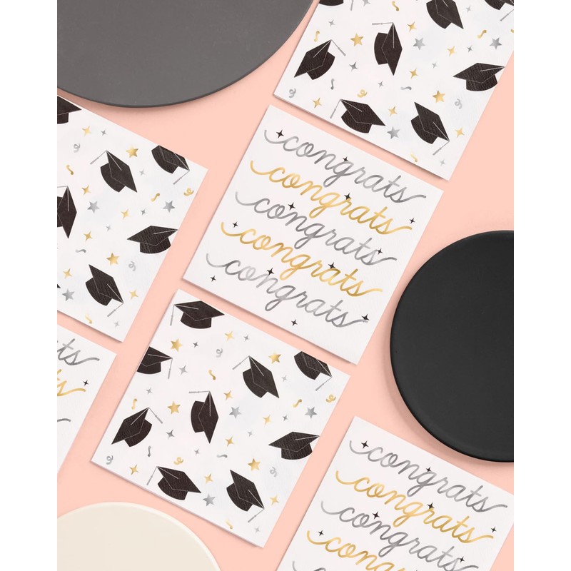 - Grad Vibes: Our set of 50 3-ply napkins is the party addition you've been looking for + a guaranteed hit! Each set comes with 2 different designs with 25 napkins of each.