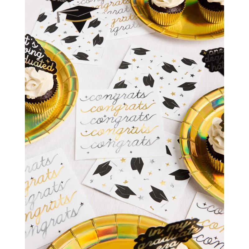 xo, Fetti Congrats Foil Graduation Napkins - 3-ply, 50 pcs | White Cocktail Napkins, Grad Dinner Party Setting, College Commencement Decoration, Celebration Tablescape
