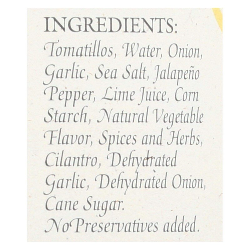 - Ingredients: Tomatoes, Water, Jalapeno Pepper, Onion, Garlic, Sea Salt, Lime Juice, Natural Vegetable Flavor, Spices And Herbs, Corn Starch, Cilantro, Dehydrated Garlic, Dehydrated Onion, Cane Sugar.