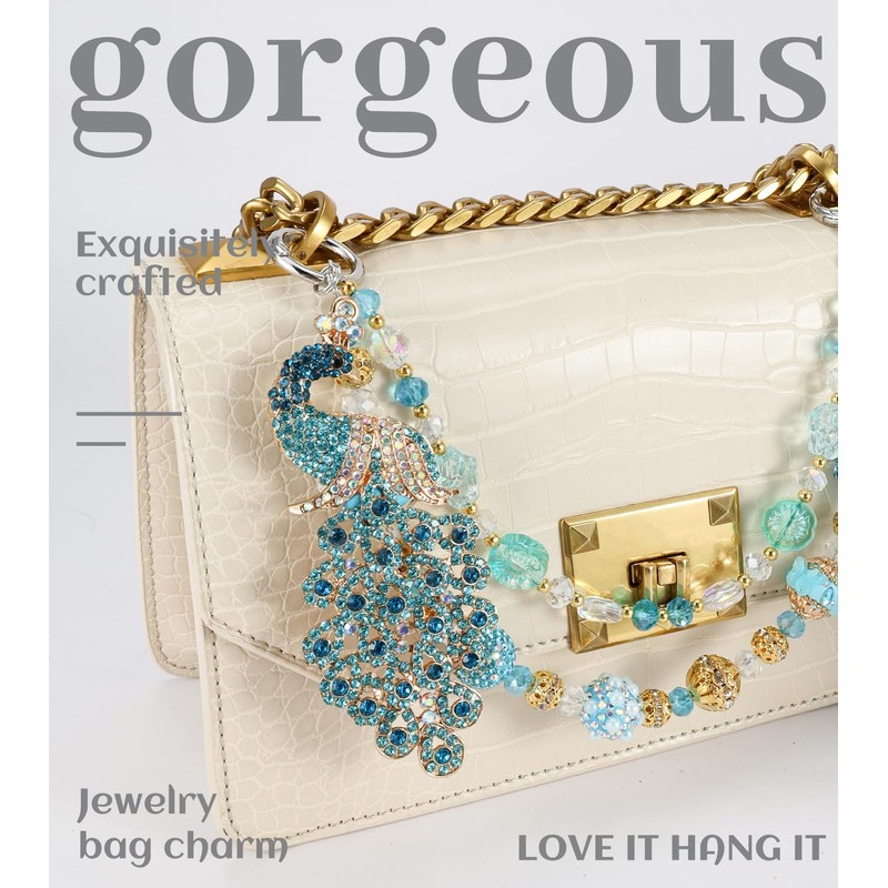 - Diamond Peacock Phone charms strap : Channeling the peacock's vivid allure, this phone wrist strap dazzles with a crystal-laden peacock focal point. Hand-threaded turquoise-shaded beads intermingle with gold-hued baubles, crafting a layered, eye-catching design. Artisans painstakingly secure each crystal and bead, merging artistry and sturdiness for a show-stopping phone accessory