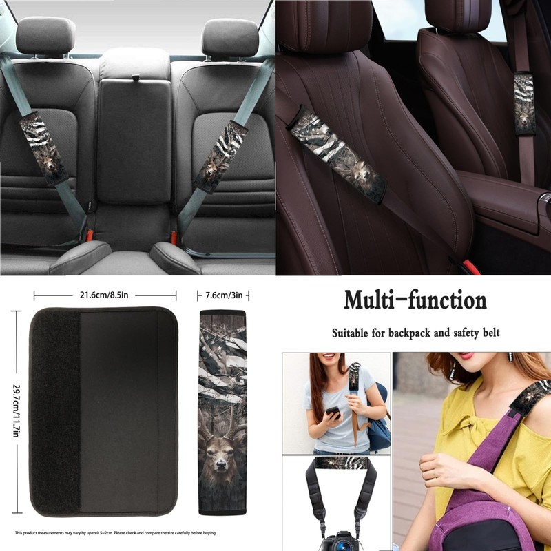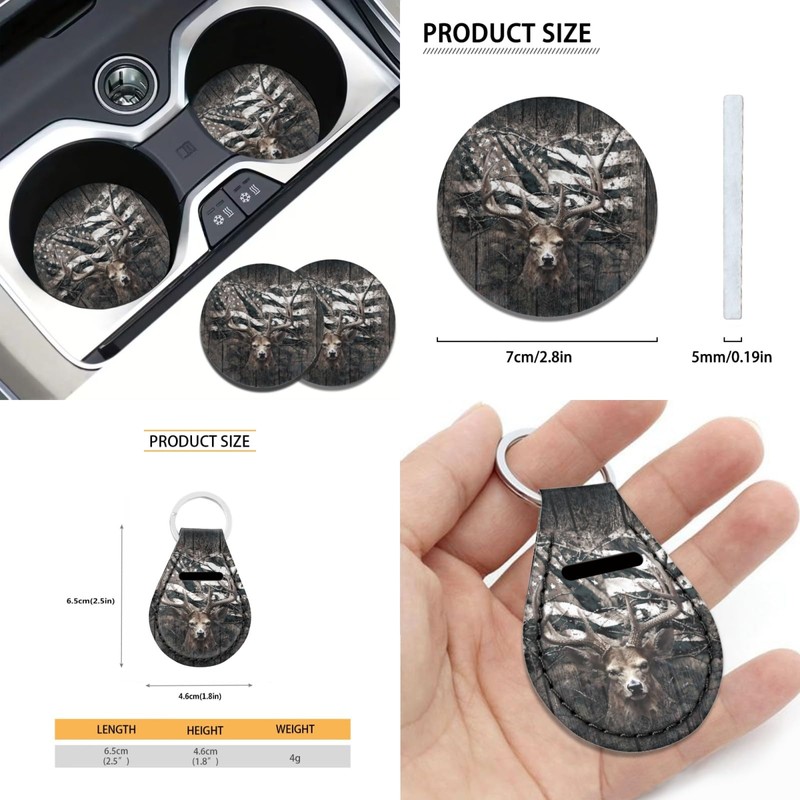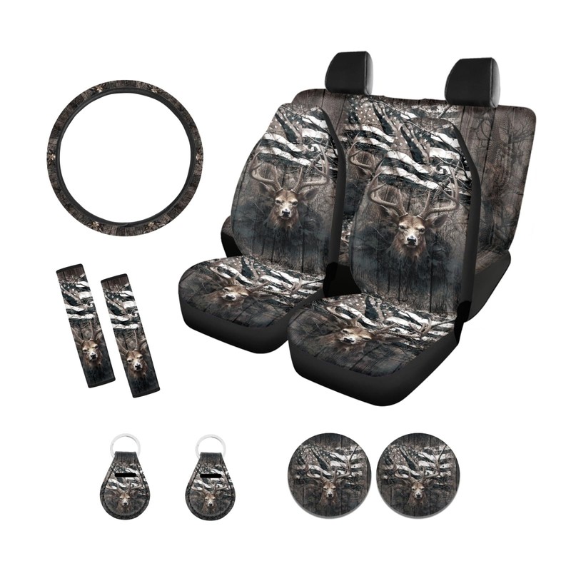 Xoenoiee Deer Flag Tree Camo Print 11 Pcs Car Accessories Full Set, Steering Wheel Cover, Front & Rear Seat Cover, Seat Belt Pads, Cup Coaster, Key Chains Universal Fit
