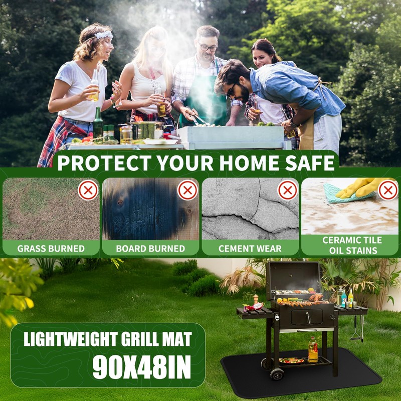 - 【90x48in Extra Large Grill Mat - 0.6mm】Our grill mat for outdoor grill size is 90 x 48in - 0.6mm, this large grill mat not only perfectly fits all types of grills like Charcoal Grill, Gas Grill, Smoker Grill, but it can also additionally accommodate a grill prep table and people. Unlike other Small sizes of grill mats, it can accommodate any size of large grill, perfect for large gatherings