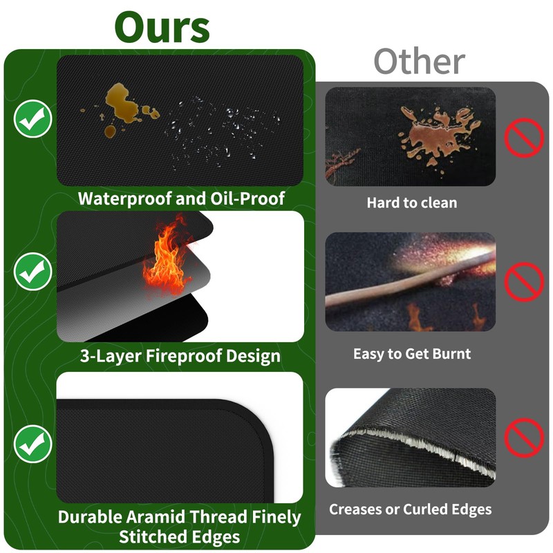 - Double-Sided Fireproof, Waterproof, Oil-Proof: Our grill mat is crafted with high quality fiberglass materials, incorporating fiberglass for fireproofing, granting heat resistance up to 2000 degrees Fahrenheit. Enhanced with a thickened silicone coating on both sides, they provide triple-layered protection against fire, water, and oil. Unlike typical outdoor grill mats, ours feature meticulously stitched edges and are engineered to resist sticking, curling, or cracking even under extreme heat