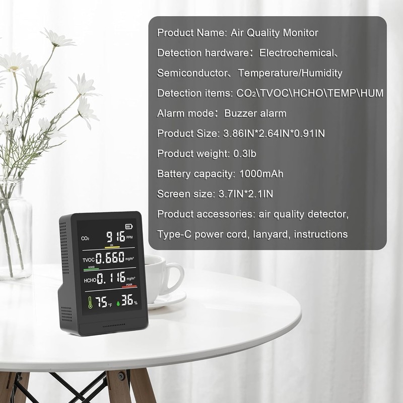 Indoor air quality monitor built-in 2100mAh battery, Type-C cable charging, standby 7-8 hours, the air quality monitor is very lightweight and can be carried around or plugged into the data cable for continuous use.