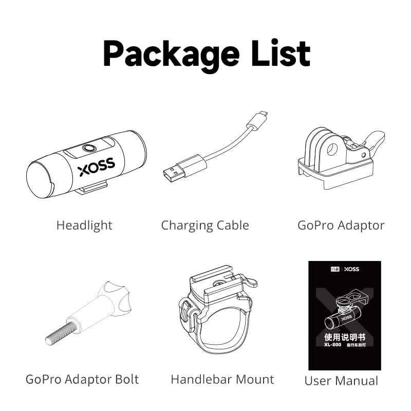 - USB Rechargeable & Power Indicator The XOSS XL-800 is adopted with a micro-USB charging interface and can be charged repeatedly without the need to replace the battery, which is fast and convenient. Carried with 2000mAh large capacity battery, which can last 2.5 hours in 800 lumens high brightness mode. You can learn the power in real time by the power indicator light to charge it in time.