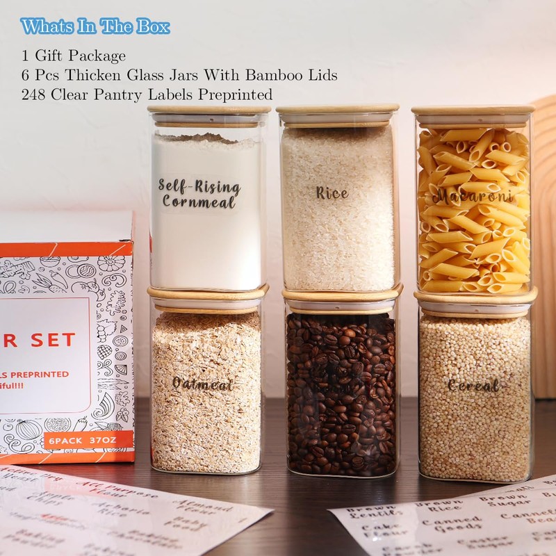 XOTAISM 6 Pcs Square Glass Pantry Storage Containers with Bamboo Airtight Lid and 248 Clear Pantry Labels Preprinted - 37oz Thicken Glass Food Storage Jars for Coffee, Cookie, Tea, Sugar, Spice